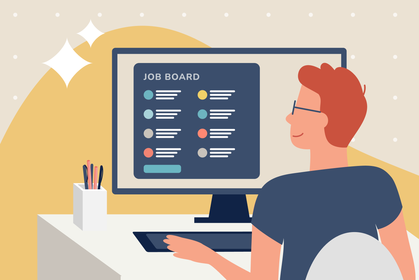 Illustration of a man looking at a digital job board on a computer screen featuring several job listings, representing someone leaving their current job and searching for a new job.