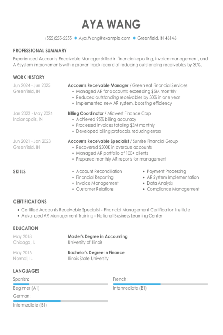 Check out our accounts receivable resume examples to understand how to highlight your financial skills, billing experience, and attention to detail. These billing and collections resume samples will help you craft a resume that appeals to finance employers.