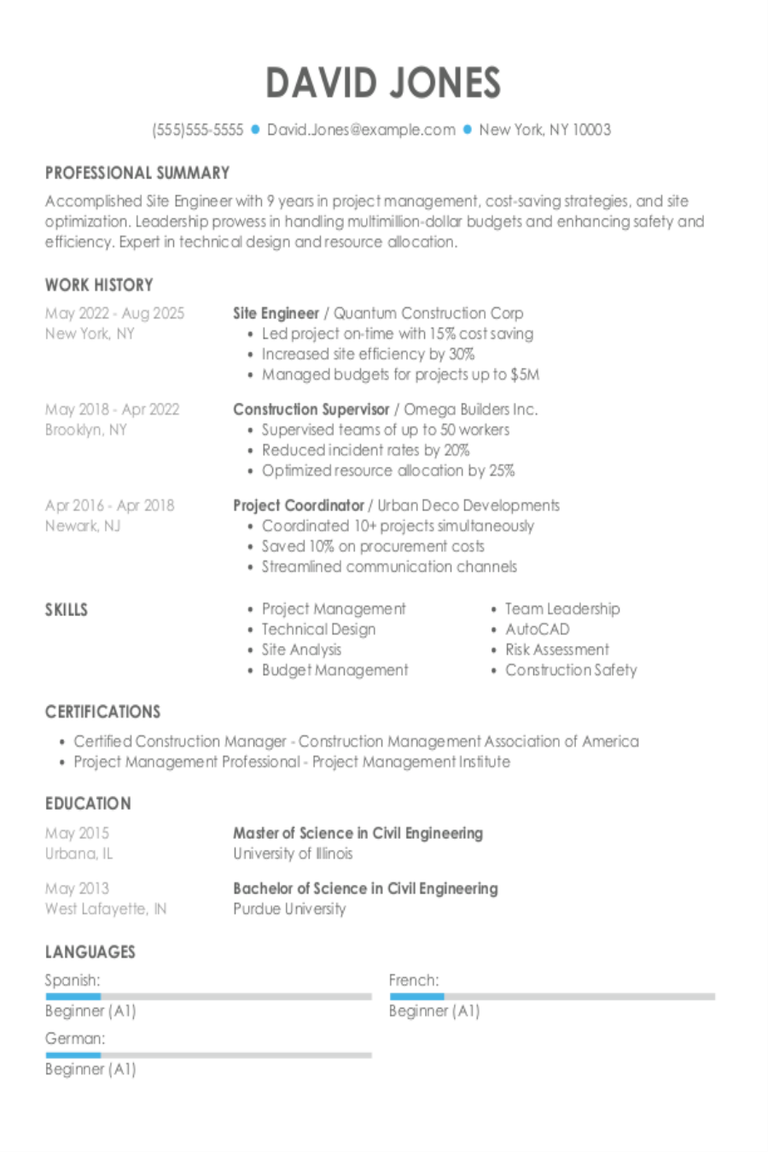Browse civil site engineer resume examples to see how to highlight your experience planning projects, overseeing construction, and ensuring safety on site. These examples and tips help you highlight your