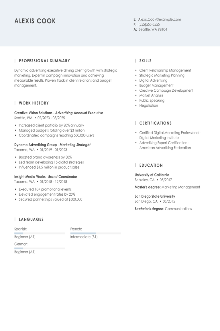 Explore how advertising account executives can showcase their creativity and client management skills. These resume examples and tips will help you write about your successful campaigns and teamwork experience.Build my
