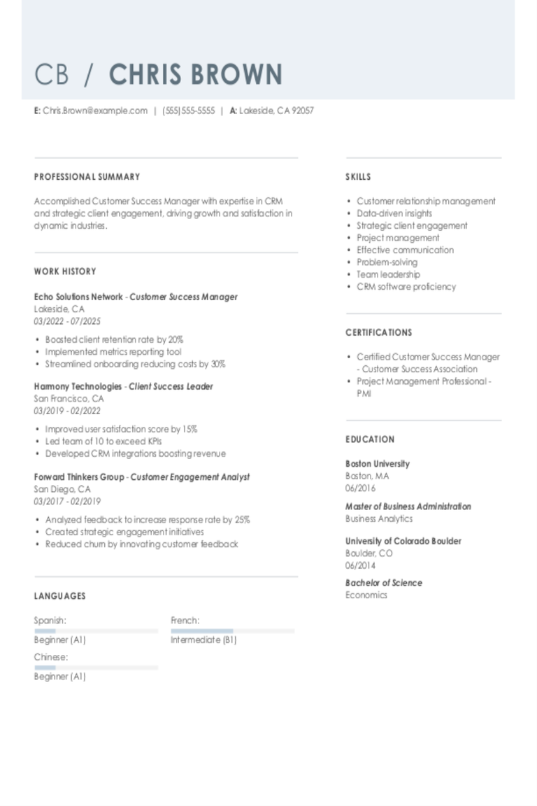 Browse customer success manager resume examples and learn how to show you build strong relationships with clients and solve their problems.Build my resumeImport existing resumeCustomize this templateWhy this resume worksQuantifies