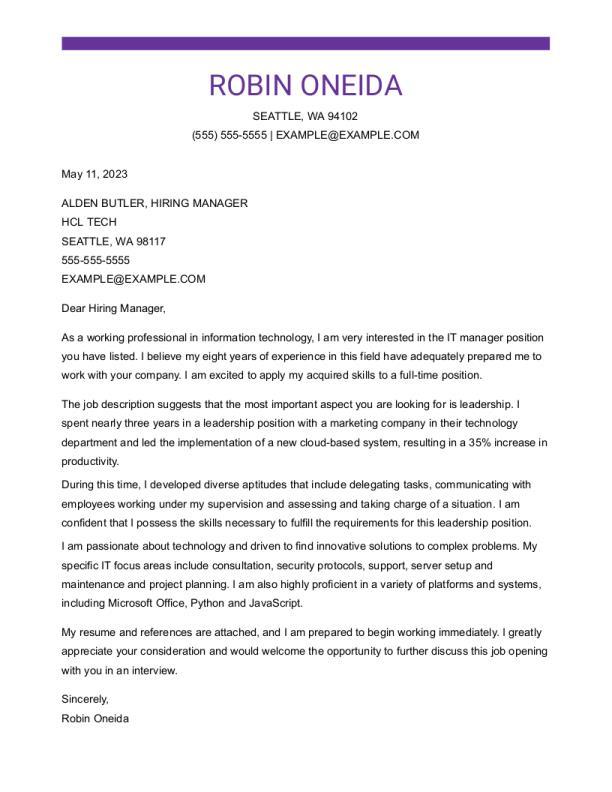 Additionally, reviewing cover letter examples tailored to IT project management can provide useful insights into how best to convey your experience and interest effectively.