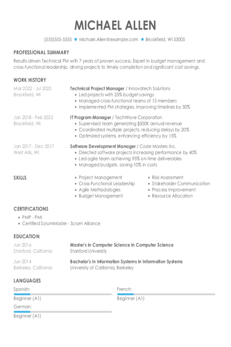 - Include relevant certifications: If you have certifications like PMP (Project Management Professional), Agile Scrum Master, or ITIL (Information Technology Infrastructure Library), make sure to highlight them prominently.