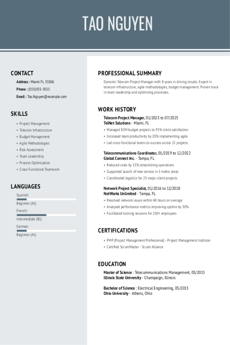 - Effective use of keywords: By incorporating role-specific keywords such as “global project management” and “IT infrastructure,” the applicant optimizes their resume for applicant tracking systems (ATS).